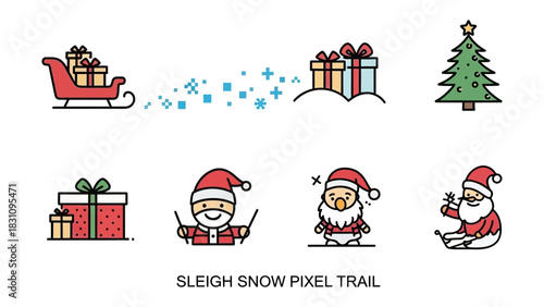 Festive Christmas Collection: A charming assembly of Christmas symbols, including a sleigh with gifts, presents, santa clause, christmas tree and festive designs.
