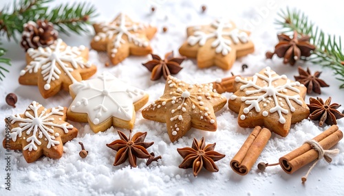 cookie, christmas, gingerbread, festive, decorated, icing, star, snowflake, spice, cinnamon, anise, sugar, holiday, baked, sweet, treat, winter, white, background, delicious