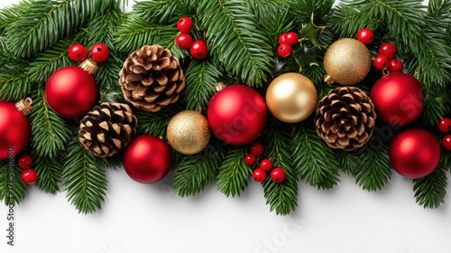 christmas, holiday, decor, decoration, pine, evergreen, tree branch, ball, red, gold, ornament, natural, festive, celebration, winter, seasonal, texture, nature, arrangement, berry, flora, green, pine cone, shiny, background, table, design, chaplet, vibrant, traditional, party, joy, family, warmth, cosy, composition, cheerful, atmosphere, spirit, luxury, beauty, closeup, fresh, classic, colours, merry, tradition, gift, home