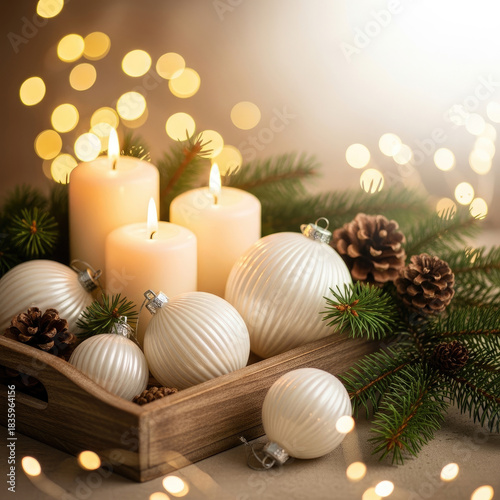 christmas, holiday, winter, decor, candle, light, ornament, pine cone, evergreen, tree branch, festive, celebration, season, warmth, cosy, atmosphere, tradition, gift, christmas, sparkle, glow, illumination, bokeh, soft, background, still, life, arrangement, table, centrepiece, home, interior, rustic, natural, green, brown, white, gold, yellow, orange, shadow, dark, contrast, closeup, detail, texture, wood, tray