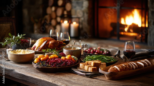 Festive christmas dinner celebration snowy cabin culinary feast cozy atmosphere warm hearth family gathering