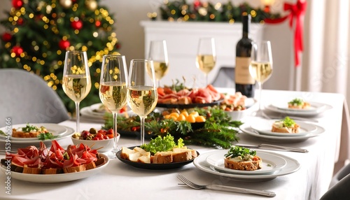 christmas, dinner, table, setting, food, wine, holiday, celebration, festive, party, family, gathering, delicious, appetiser, christmas tree, decoration, elegant, feast, new year