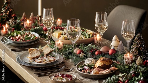 holiday, christmas, dinner, table, setting, food, wine, goggles, candle, ornament, decoration, festive, celebration, joy, family, friends, togetherness, meal, feast, tradition, december, winter, cosy, warm, rustic, elegant, beautiful, home, kitchen, dining, table setting, tableware, silverware, centrepiece, garland, greenery, pine, fir, red, gold, white, brown, wooden, light, romantic, ambience, special