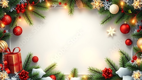 Festive christmas frame with ornaments, lights, and gifts on a bright surface, creating a cozy holiday atmosphere