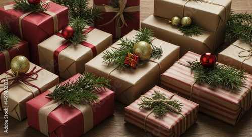 Festive Christmas Gift Collection - An array of beautifully wrapped Christmas presents adorned with evergreen sprigs and ornaments. Perfect for holiday greetings