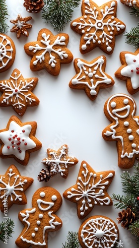 christmas, gingerbread, cookie, holiday, festive, baking, dessert, sweet, treat, snowflake, star, icing, sugar, winter, decoration, homemade, delicious, candy, sprinkle, pine cone, winter landscape, holiday season, gourmand, confectionery, culinary, baked goods, pastry, food photography, white background, topview