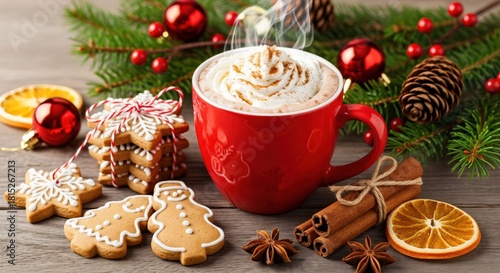 Festive Christmas Holiday Scene with Steaming Hot Chocolate Topped with Whipped Cream, Assorted Gingerbread Cookies, and Traditional Winter Spices on a Rustic Wooden Table