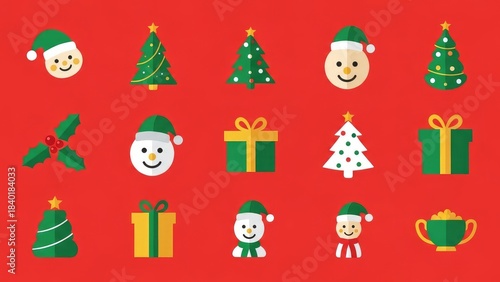christmas, holiday, icon, set, snowman, tree, gift, holly, festive, winter, decoration, celebration, red, green, flat, symbol, seasonal, christmas, cheerful, happy, present, ornament, santa, elf, award, banner, santa, christmas tree, snow, illustration