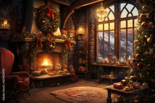 Festive Christmas interior room. Fire decor. Generate Ai