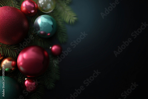 Festive Christmas Ornaments: A vibrant display of red, green, and gold baubles nestled among lush evergreen boughs, radiating holiday cheer.