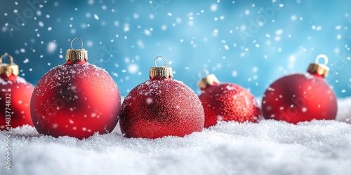 Festive christmas ornaments advent celebration holiday holidays banner greeting card - Collection of many red christmas bauble on snow table, with blue sky and snowflakes in background (Generative