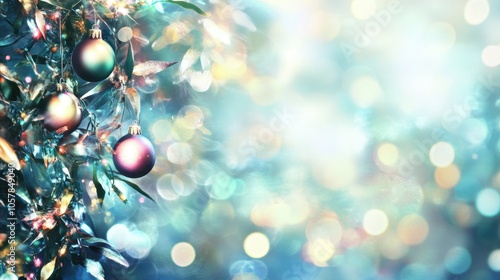Festive Christmas Ornaments on Evergreen Tree with Bokeh