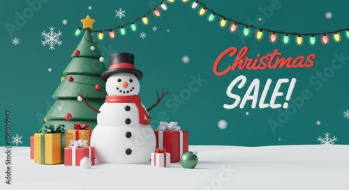 Festive Christmas sale with snowman, decorated tree, and wrapped gifts