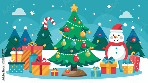 christmas, tree, snowman, gift, snow, winter, holiday, season, celebration, decoration, ornament, light, candy, cane, festive, greeting, background, illustration, flat, design, vector, cute, scene, snowy, night, star, cloud, new, year, joy, merry, eve, spirit, seasonal