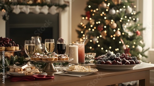 christmas, table, setting, dessert, drink, pastry, champaign, wine, milk, juice, cranberry, strawberry, pine cone, fireplace, tree, light, decoration, holiday, celebration, festive, gathering, food, sweet, delicious, winter, cosy, warm, elegant, beautiful, gold, silver, white, red, brown, green, present, gift, family, friends, joy, season