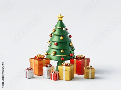 Festive Christmas tree decorated with ornaments stands proudly among colorful wrapped gifts on a bright background