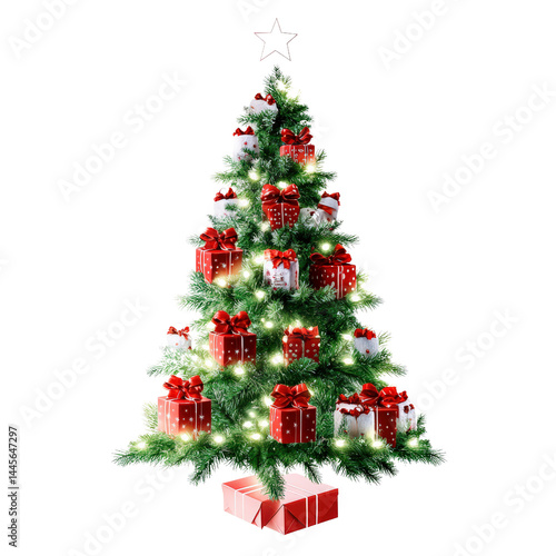 Festive Christmas Tree decorated with red and gold presents and ornaments, topped with star, glowing lights, traditional holiday decoration scene