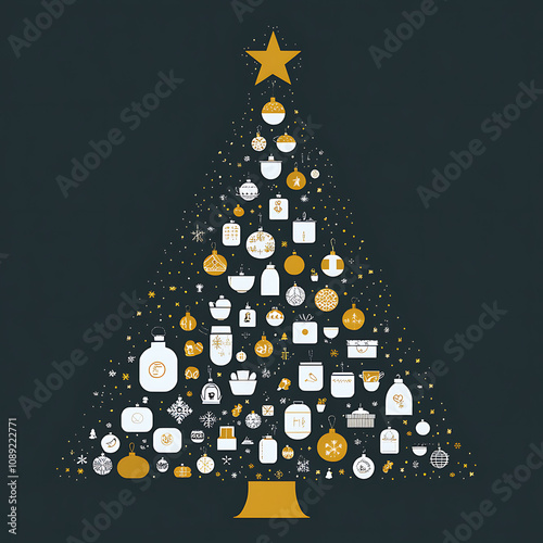Festive Christmas Tree Design Filled with Ornaments, Stars, and Decorations in a Stylish Minimalist Style for Holiday Marketing, Invitations, or Seasonal Projects