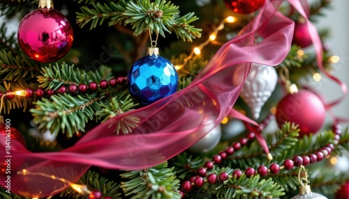 holiday, background, christmas, tree, ornament, decoration, festive, ribbon, light, red, blue, silver, green, sparkling, bulb, winter, celebration, home, cosy, tradition, cheerful, bright, shiny, accessory, beauty, seasonal, decor, pine, tree branch, bauble, atmosphere, family, gathering, gift, joy, warmth, hugs, happiness, indoor, arrangement, style, elegance, charme, shimmer, twinkle, magic, ambience, spirit
