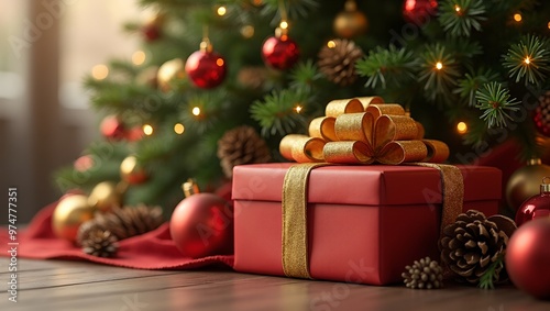 Festive Christmas tree with gift box wrapped in gold ribbon