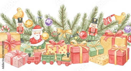 christmas, watercolor, illustration, border, toy, present, gift, holiday, winter, festive, decor, decoration, design, element, graphic, background, texture, pattern, seasonal, celebration, joy, tradition, family, santa, nutcracker, train, tree, branch, evergreen, ornament, bow, ribbon, candy, cane, yellow, bird, pink, green, gold, vintage, cute, charming, cheerful, merry, bright
