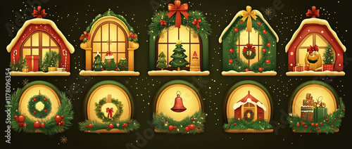 christmas, winter, holiday, festive, decoration, window, scene, chaplet, gift, present, tree, light, snow, house, home, celebration, season, joy, happiness, design, element, illustration, graphic, art, image, visual, background, card, banner, digital, template, collection, set, merry, ornament, bell, garland