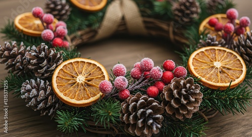 Festive Christmas Wreath with Pine Cones Oranges and Red Berries Decoration