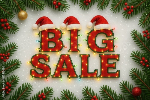 Festive Christmas-themed image with "BIG SALE" text adorned with Santa hats and colorful lights, surrounded by snow, holly, and pine branches for holiday promotions.