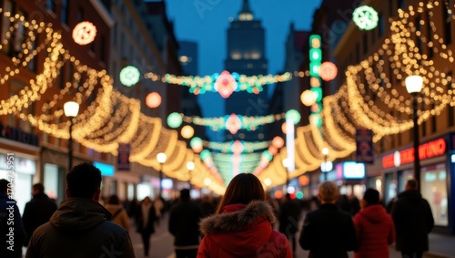 Festive City Street Illuminated by Warm Christmas Lights in the Evening