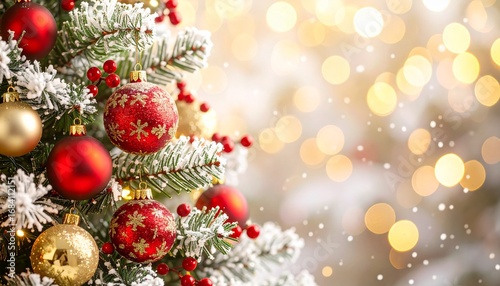 Festive close-up of a snow-dusted Christmas tree featuring elegant red and gold baubles, with sparkling bokeh lights creating a magical holiday atmosphere