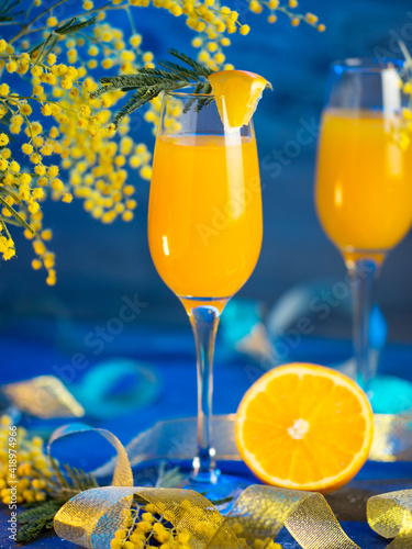 Festive cocktail mimosa in glasses, blooming mimosa branches, blue bright fountain