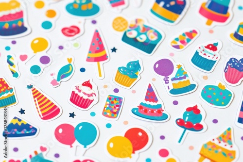 sticker, festive, balloon, cake, confetti, party, hat, celebration, decoration, colourful, fun, festivity, birthday, event, cheerful, design, graphic, supply, accessory, children, joyful, art, creativity, planning, scrapbooking, invitation, playful, seasonal, designed, arrangement, imagination, hand-made, gathering, special, occasion, collection, theme, party, event, generative, ai