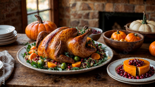 turkey, roast, dinner, holiday, thanksgiving, feast, table, candle, pumpkin, autumn, vegetable, sprout, couscous, festive, family, meal, savoury, gold, crispy, herb, rosemary, cranberry, pomegranate, garnish, warm, delicious, seasonal, comforting, homemade, rustic, wholesome, vibrant, centrepiece, celebration, tradition, gathering, food, favor, culinary, dining, elegant, hearty, baked, side, cooked, cosy, inviting, harvest, banquet