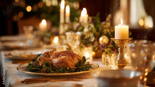 Festive dinner table with roast chicken and candlelight during holiday celebration
