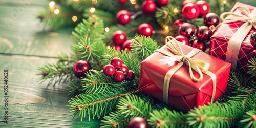 christmas, gift, tree, red, white, ribbon, bow, ornament, festive, holiday, elegant, decoration, celebration, present, pine, branch, winter, season, star, tradition, joy, happiness, family, giving, love, warmth, peace, magic, spirit, light, cheer