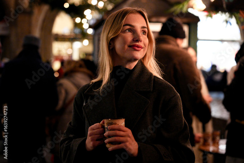 munich, christmas, market, wine, hot, drink, woman, night, bavaria, german, holiday, winter, december, festive, warm, coat, joy, seasonal, beverage, lifestyle, tour tourism, travel, europa, celebration, light, tradition, street, fair, candid