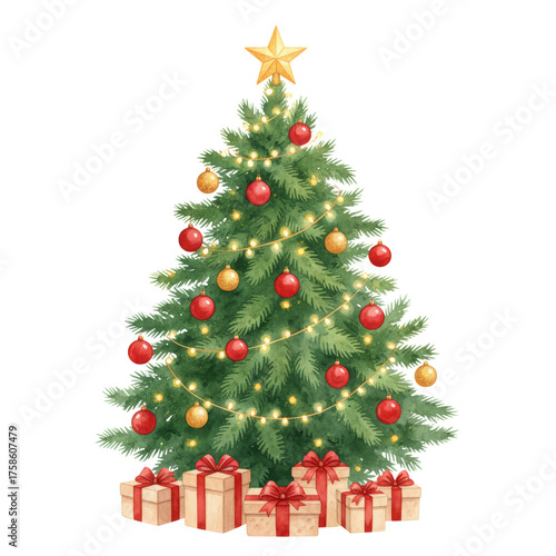 Festive evergreen adorned with twinkling lights and vibrant ornaments isolated celebration