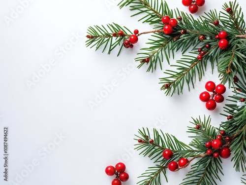 Festive evergreen branches with bright red berries arranged on a light background for seasonal decoration during the holidays. Christmas and New Year