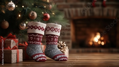 Festive family socks under Christmas tree, holiday gifts, cozy ambiance, 3D illustration