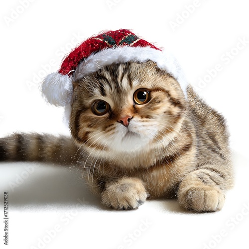 Festive Feline: A cute and charming tabby cat, adorned with a Santa hat, gazes at the viewer with adorable curiosity and festive spirit.