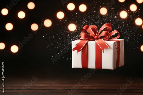Festive Gift Box with Red Ribbon and Sparkles Over Blurred Golden Bokeh Background for Holiday Celebrations and Events