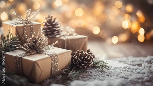 gift, christmas, present, winter, holiday, season, festive, celebration, joy, happiness, brown, paper, wrapping, ribbon, bow, pine, cone, sprig, evergreen, branch, snowy, snow, surface, bokeh, light, sparkle, glistering, gold, beige, warm, cosy, rustic, elegant, simple, natural, decoration, ornament, background, image, photo, aesthetic, mood