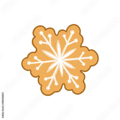 Festive gingerbread snowflake cookie with icing decoration, holiday dessert illustration in flat style.