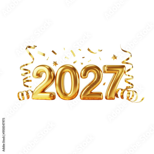 2027, new year, gold, gold, number, year, celebration, confetti, ribbon, streamer, festive, event, holiday, greeting, typography, numeral, shiny, metallic, bright, sparkling, abstract, design, graphic, element, party, anniversary, future, calendar, date, time, occasion, joy, happy, congratulation, luxury, elegant, modern, three-dimensional, render, isolated