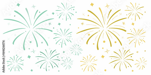 fireworks, celebration, party, new year, holiday, festive, sparkler, firecracker, explosion, light, bright, colourful, gold, green, white background, vector, illustration, design, graphic, abstract, pattern, celebratory, event, anniversary, birthday, congratulation, joy, happiness, star, sparkle
