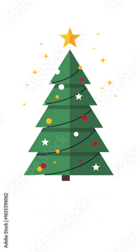 Festive Green Christmas Tree Illustration on Black Background with Gold Star and Decorations