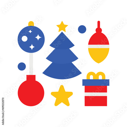christmas, holiday, tree, ornament, star, gift, decoration, festive, celebration, blue, red, yellow, white, graphic, vector, illustration, icon, set, design, abstract, simple, modern, flat, cheerful, joyful, seasonal, winter, greeting, christmas, party