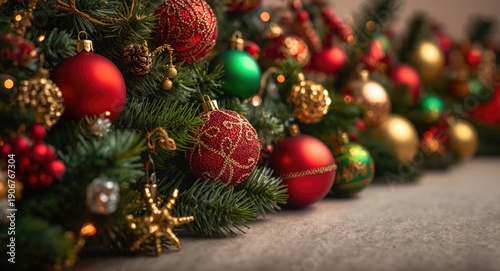 Festive holiday backdrop featuring colorful Christmas ornaments with seasonal greenery in warm red and green hues