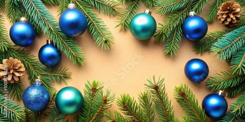 Festive holiday background with fir blue pine branch and Christmas ball decorations