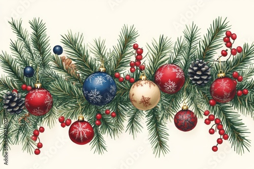 Festive holiday decorations featuring colorful ornaments and festive greenery in a winter setting
